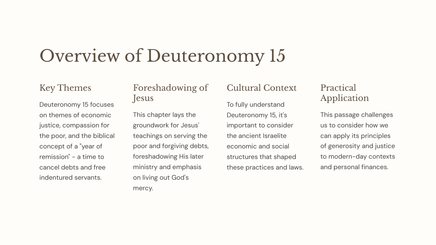 In the book of Deuteronomy, chapter 15 provides a deeper understanding of God's laws and their application to the Israelites' lives. This passage explores the principles of debt relief, generosity, and caring for the less fortunate among the people.