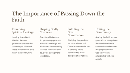 As Moses neared the end of his life, he charged the Israelites to be faithful to the Lord and pass on His teachings to the next generation. This section explores how God's people can effectively disciple and equip the youth to follow Him.