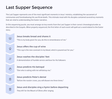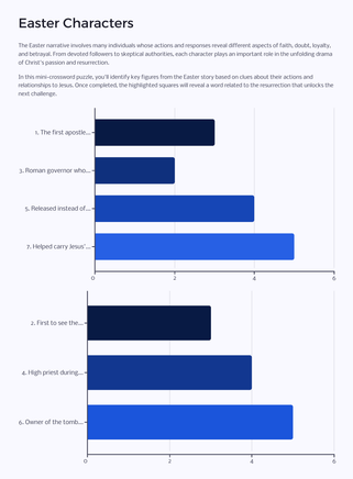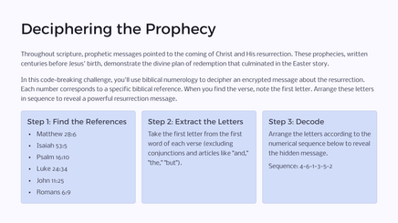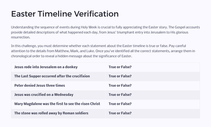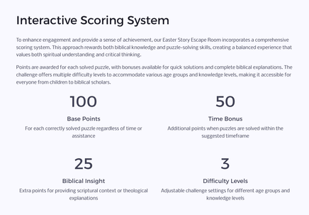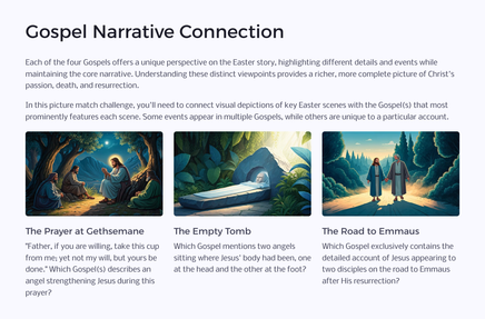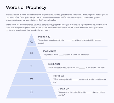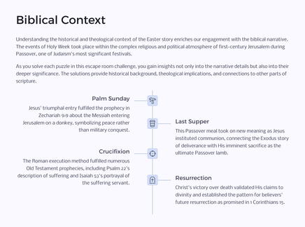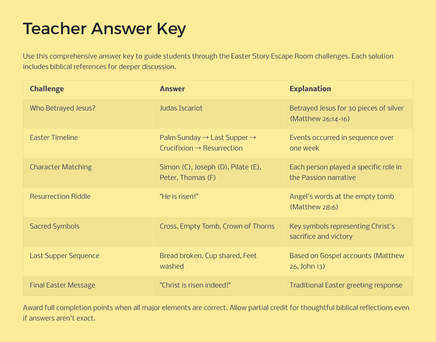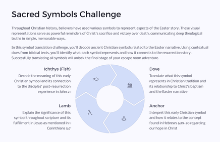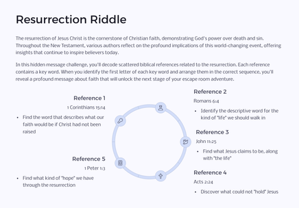As you journey through the Easter narrative, you'll encounter various types of puzzles that require careful reading of the Gospel accounts, critical thinking, and teamwork. Each challenge unlocks a new aspect of the story, bringing the biblical text to life in a fresh and exciting way.