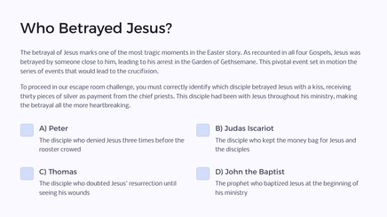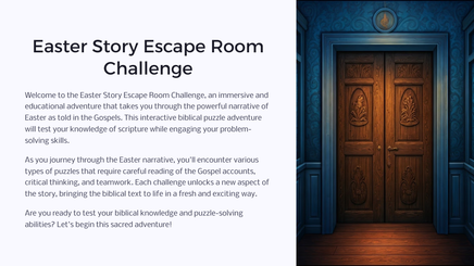 Welcome to the Easter Story Escape Room Challenge, an immersive and educational adventure that takes you through the powerful narrative of Easter as told in the Gospels. This interactive biblical puzzle adventure will test your knowledge of scripture while engaging your problem-solving skills.