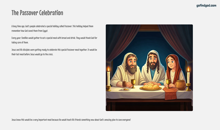 • Show images or video clips of Passover traditions and how they connect to Communion today.