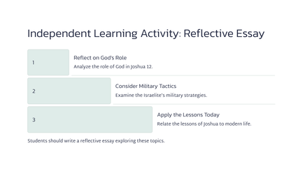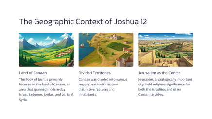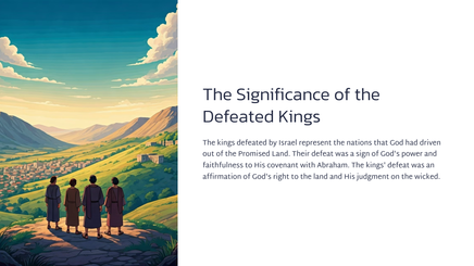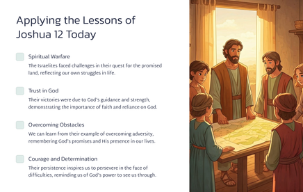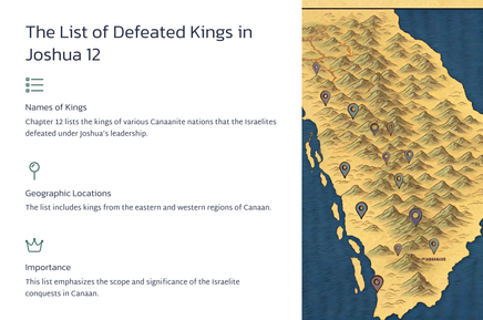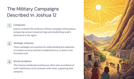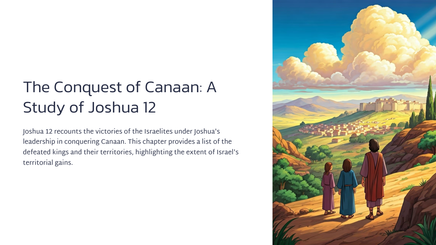 Joshua 12 recounts the victories of the Israelites under Joshua's leadership in conquering Canaan. This chapter provides a list of the defeated kings and their territories, highlighting the extent of Israel's territorial gains.