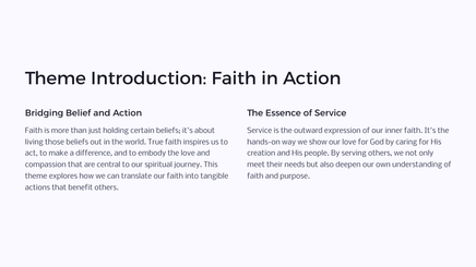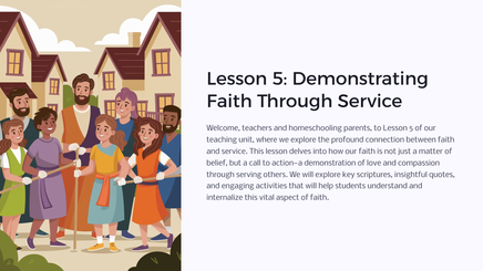 Welcome, teachers and homeschooling parents, to Lesson 5 of our teaching unit, where we explore the profound connection between faith and service. This lesson delves into how our faith is not just a matter of belief, but a call to action—a demonstration of love and compassion through serving others. We will explore key scriptures, insightful quotes, and engaging activities that will help students understand and internalize this vital aspect of faith.